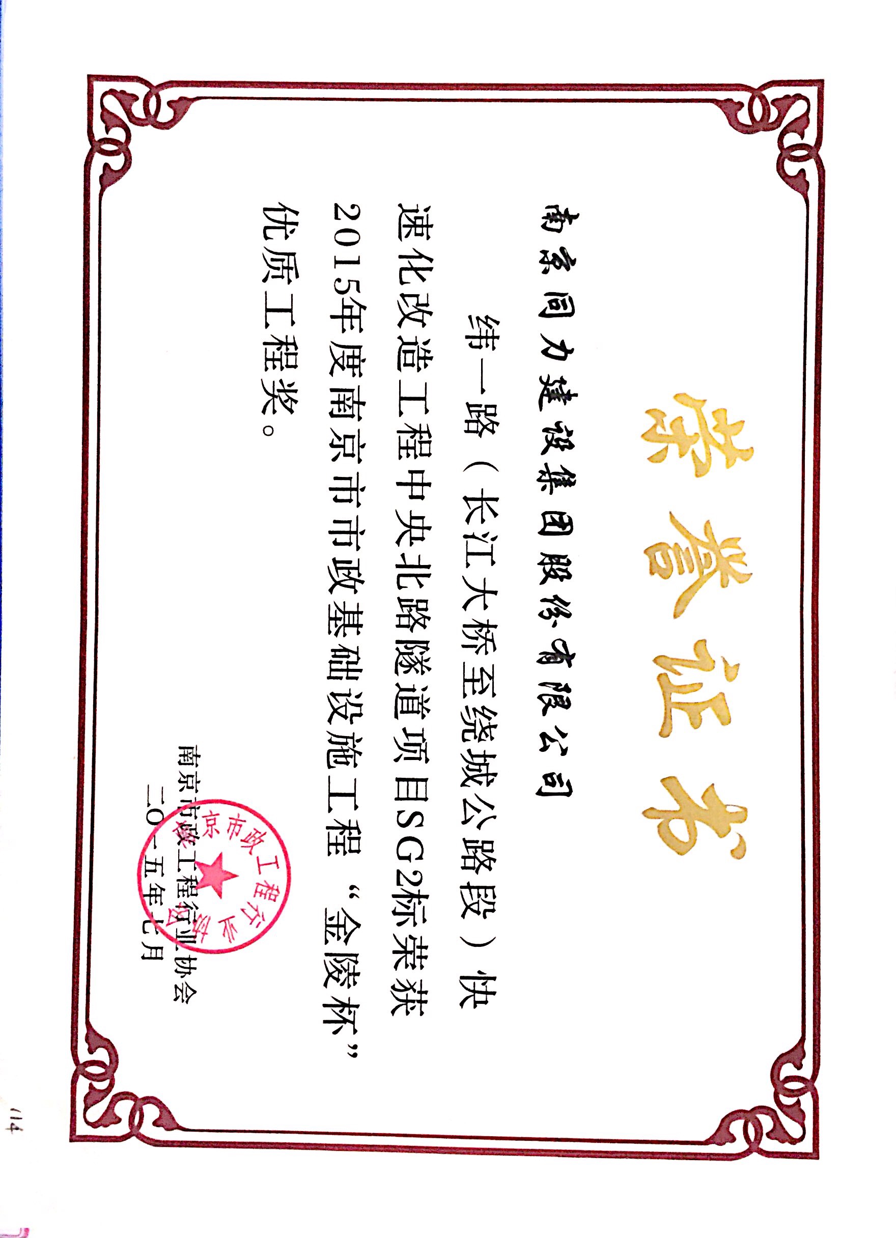 集庆门隧道项目工程获得“金陵杯”优质工...