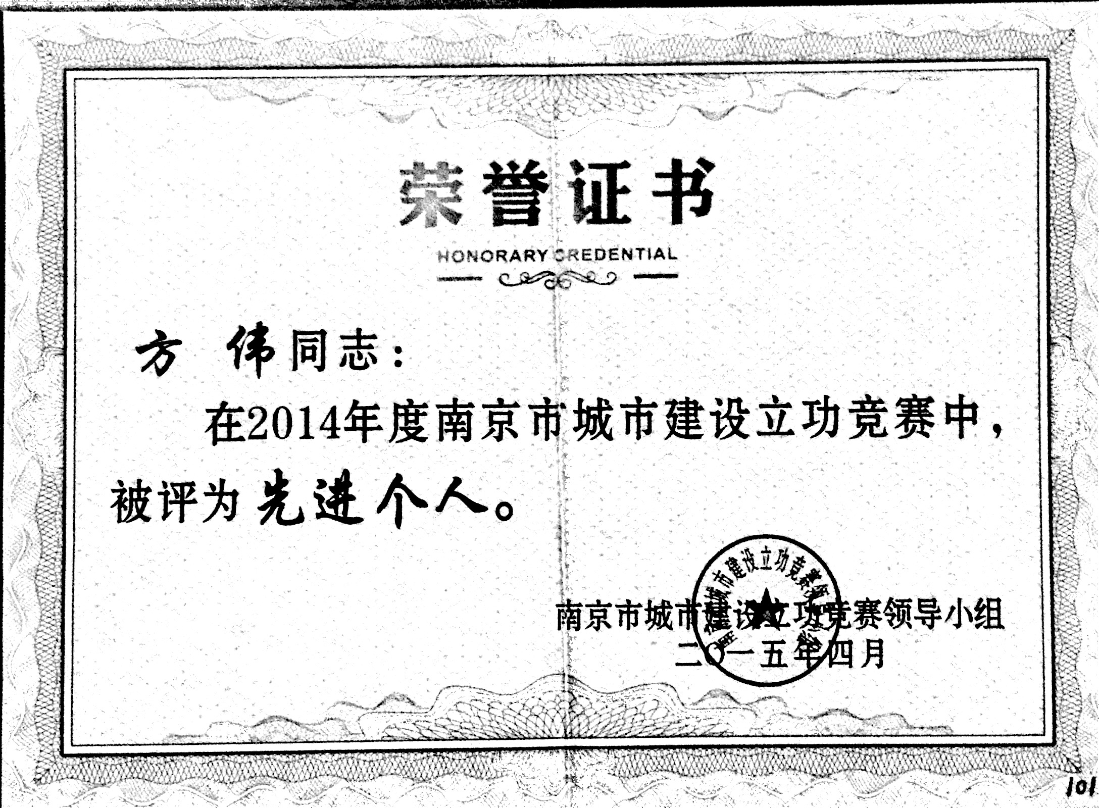 公司方伟在2014年度南京市城市建设立功...