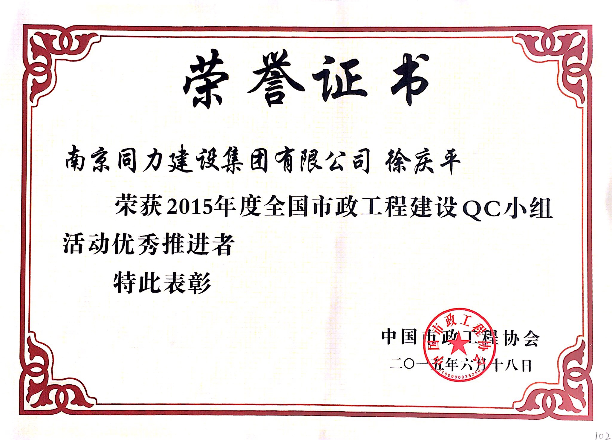 公司徐庆平荣获2015年度全国市政工程建...