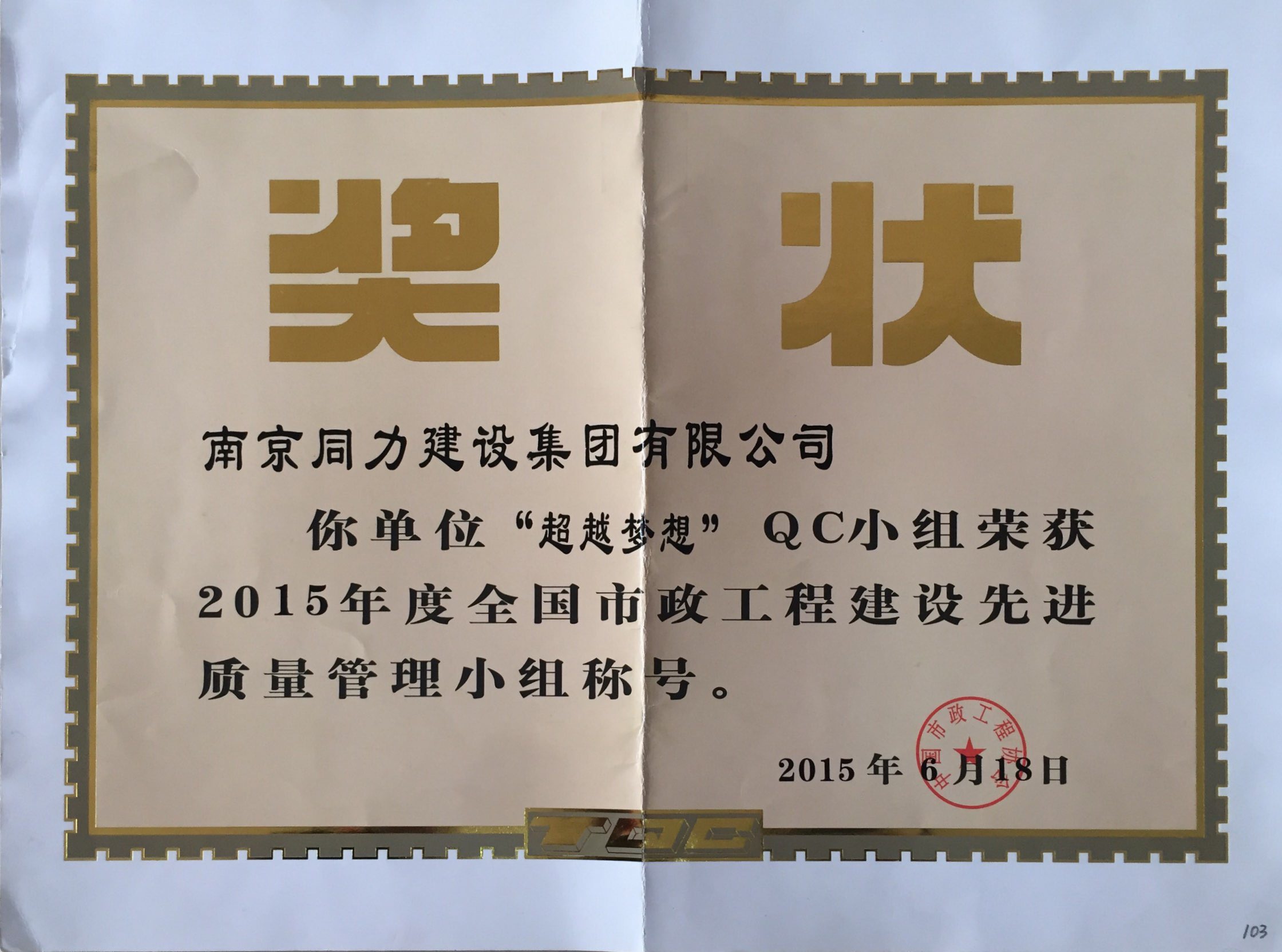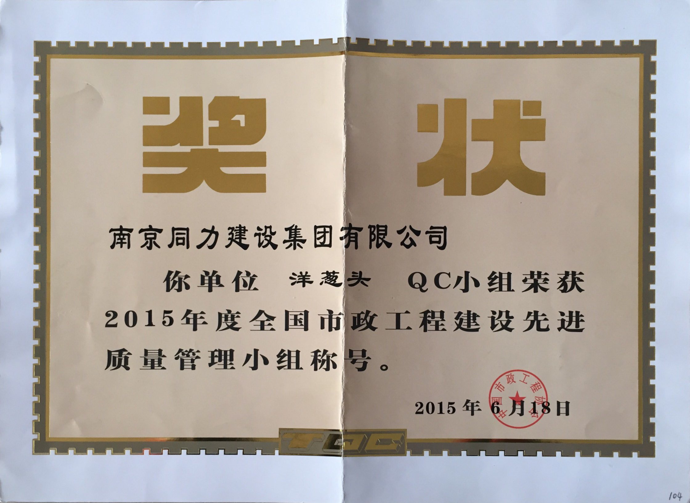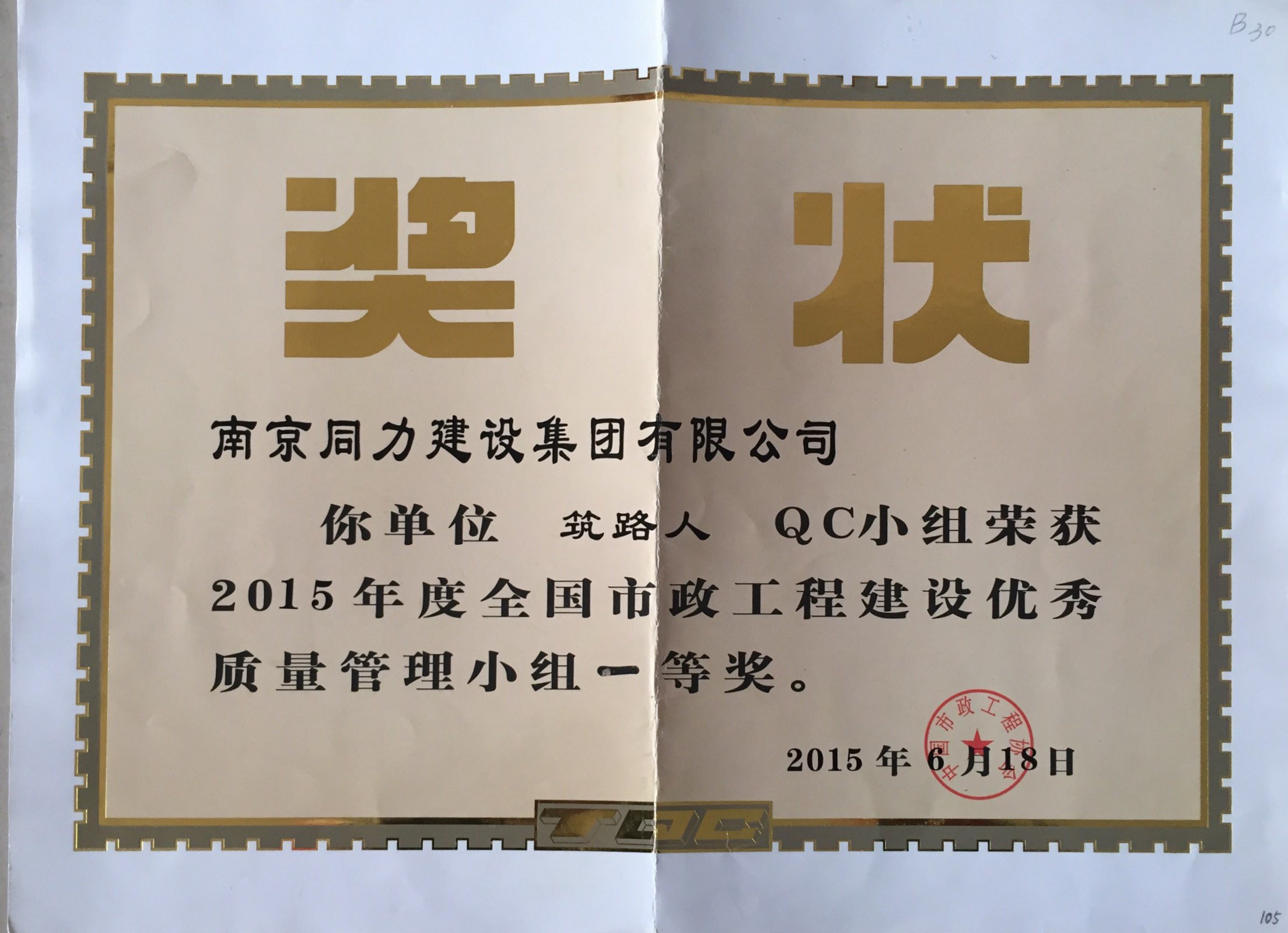 公司“筑路人”QC小组荣获2015年度全国市...