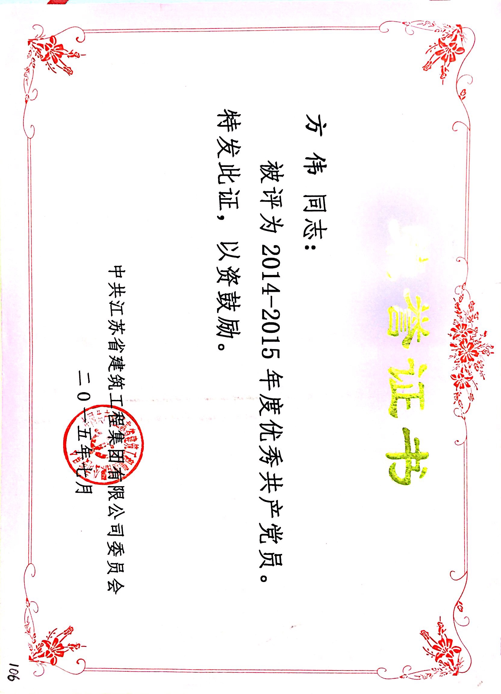 公司方伟被评为2014-2015年度优秀共产...