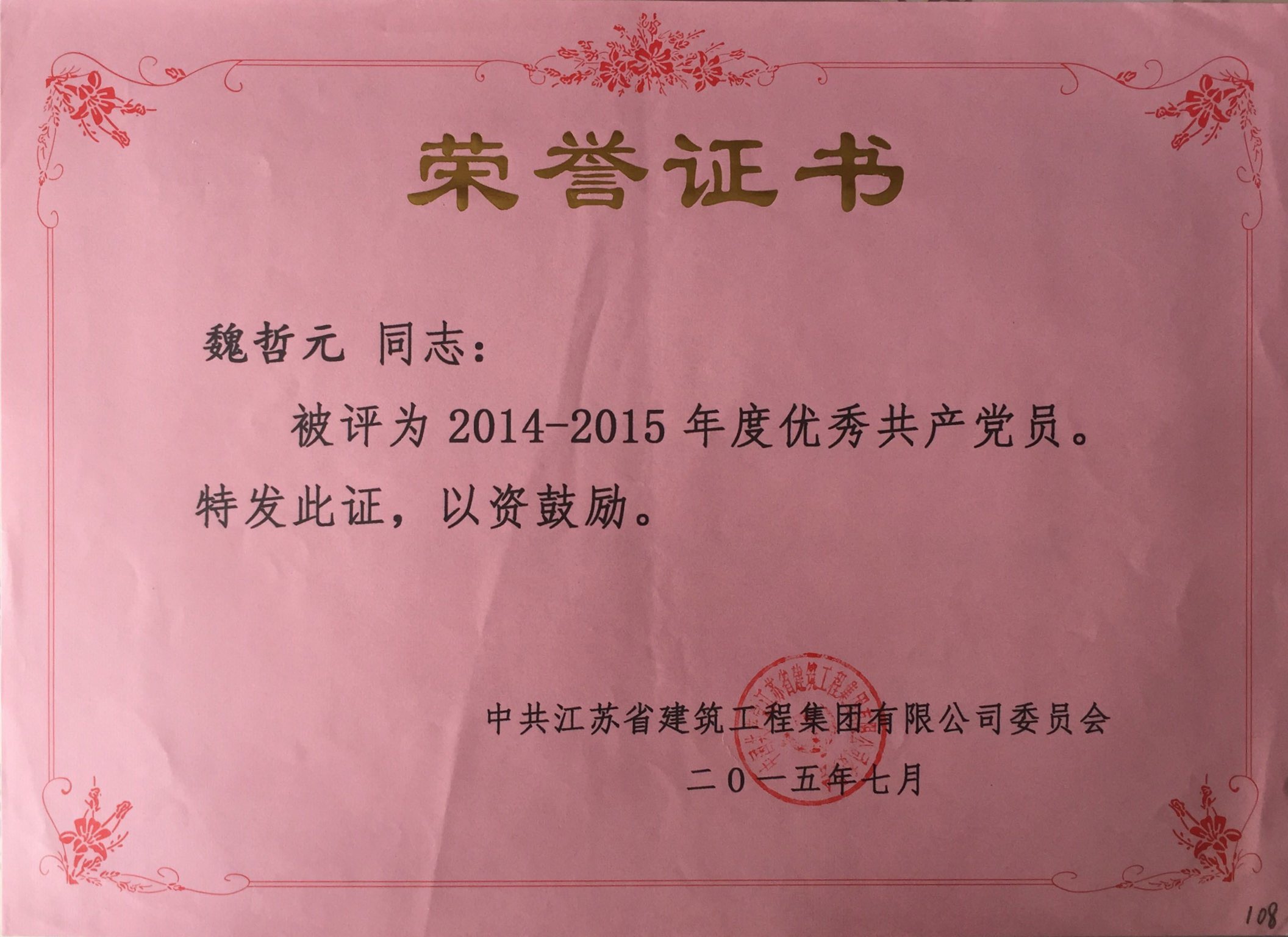 公司魏哲元被评为2014-2015年度优秀共...