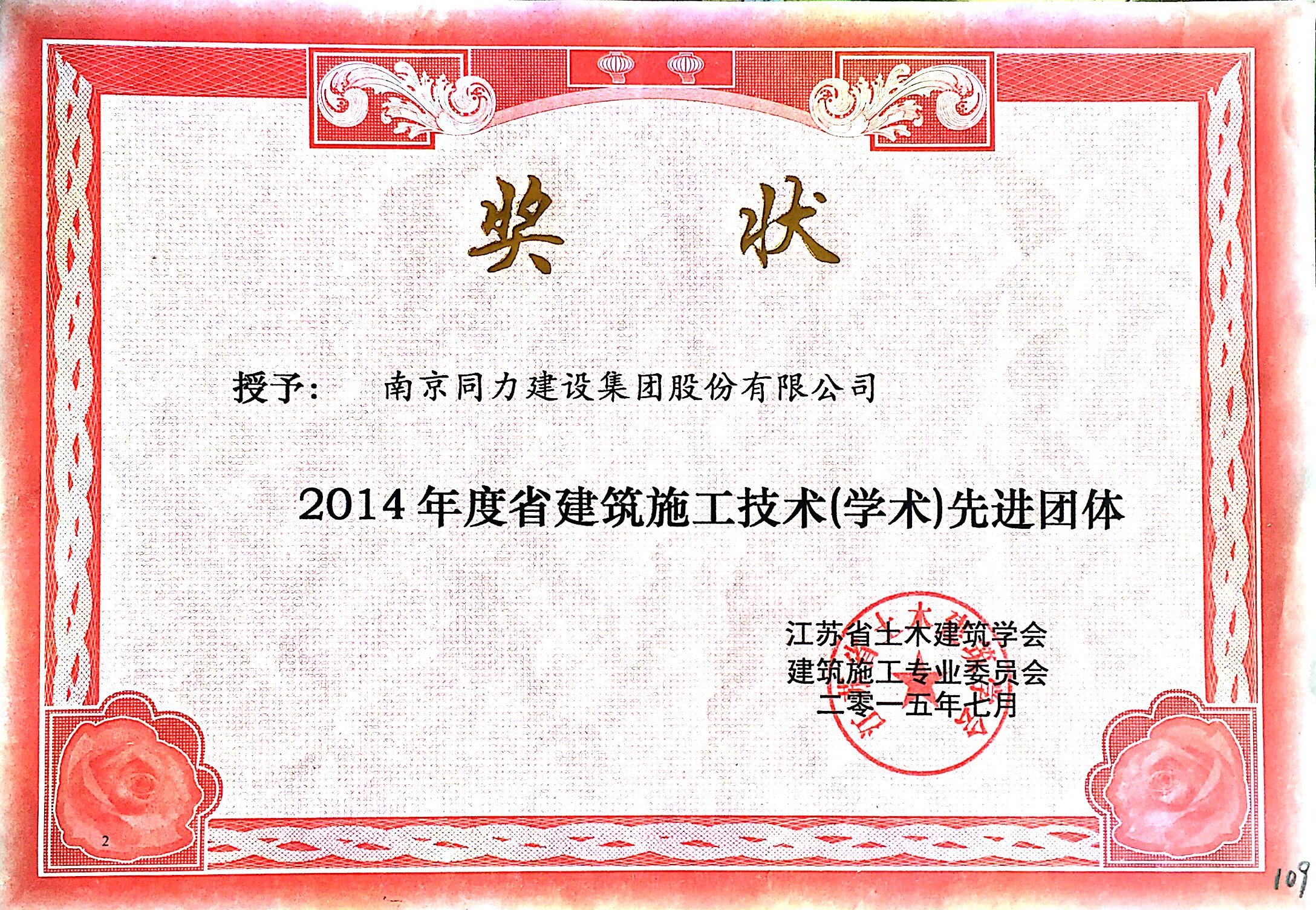 公司被授予2014年度省建筑施工技术(学...